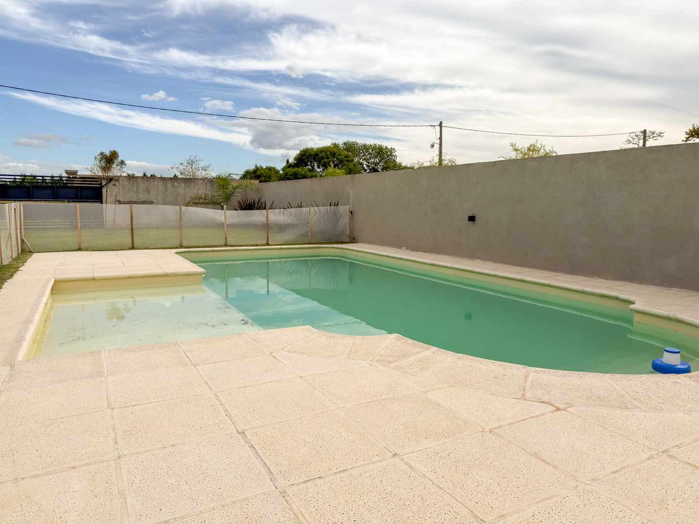 Pileta de 8 x 4 metros con baldosas atérmicas, escalera romana y playa húmeda